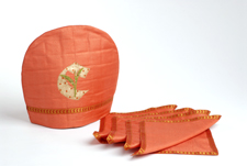 Made with fine cotton the napkins and cozie have woven brocade trim around them. Tea cozie is block-printed manually with two leaves and a bud which are decorated with color matching sequins. Our set of tea cozie includes generously padded tea cozie and four beautiful napkins.